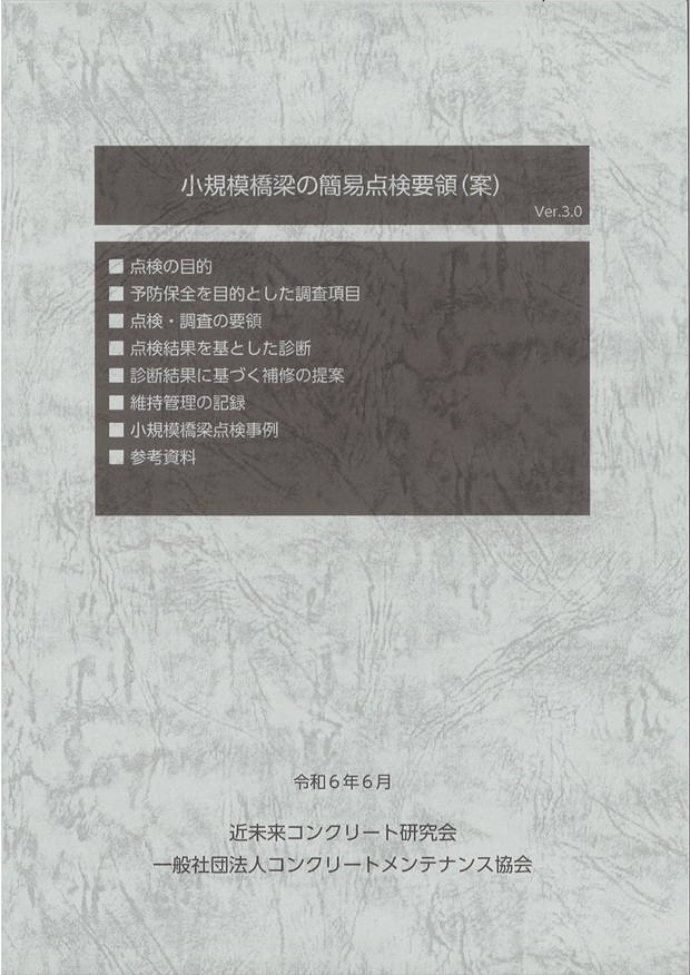 そこで、近未来コンクリート研究会と一般社団法人コンクリートメンテナンス協会は、大多数を占める小規模の鉄筋コンクリート橋を対象に、予防保全を目指した点検を効果的に行うための点検要領(案)を整備することとした。また、この点検で得られた評価をもとに、予防保全を目的とした延命化対策および鉄筋の腐食が進行している場合の補修方法の提案を行うこととした。この予防保全を目的とした点検要領(案)が有効に活用されることを願う次第である。