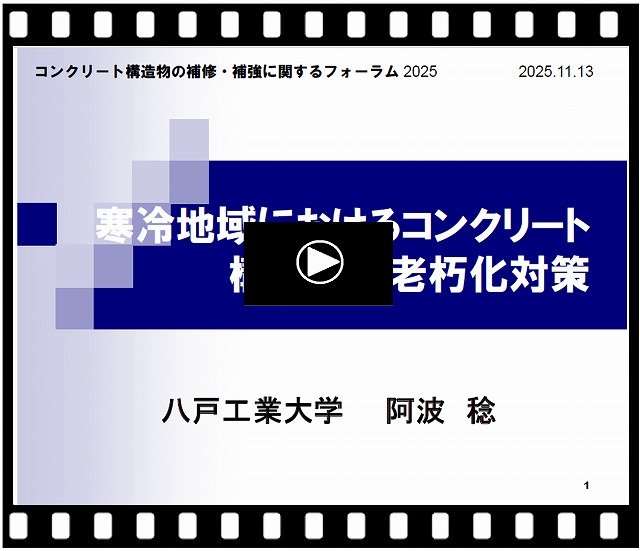 | 「寒冷地域におけるコンクリート構造物の老朽化対策」 | 阿波 稔先生(八戸工業大学大学院教授 | 60分 | 1.0単位 | ![]() |